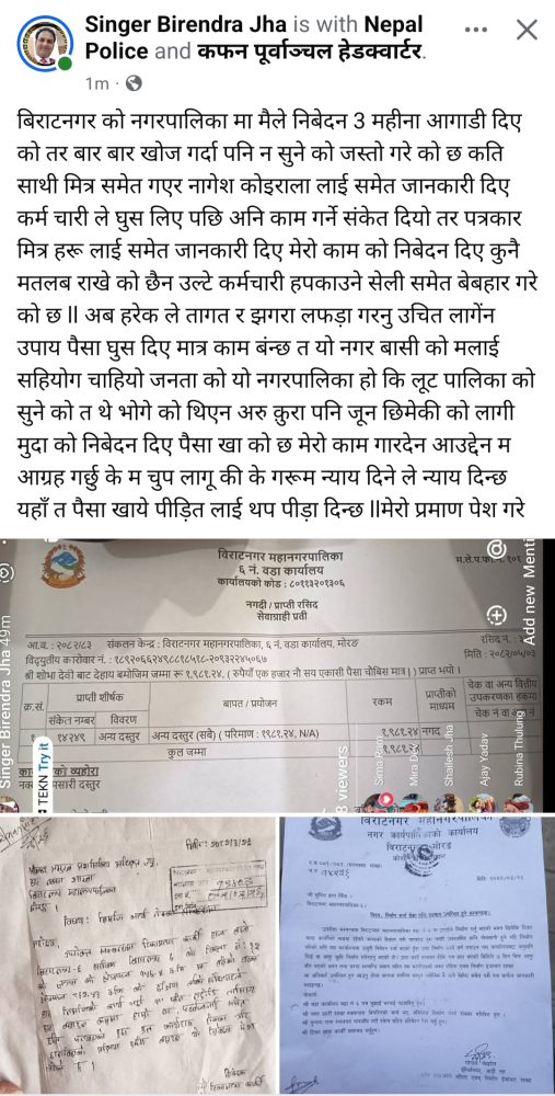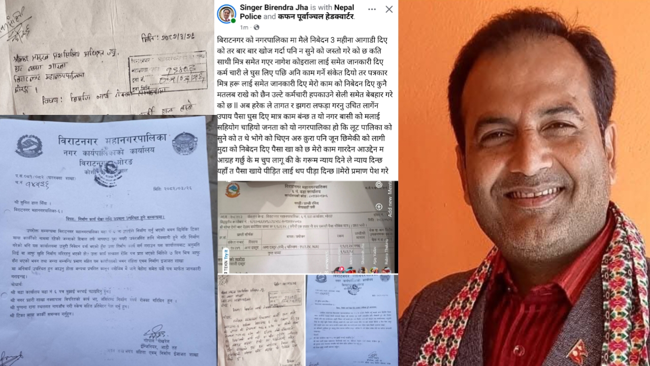 विराटनगर / गायक वीरेन्द्र झाले विराटनगर महानगरपालिकामा घुसखोरी र प्रशासनिक बेवास्ताको गम्भीर आरोप लगाएका छन्। झाले सामाजिक सञ्जालमा लेखेको पोस्टमा महानगरपालिकाका कर्मचारीहरूले घुस नलिए काम नगर्ने गरेको दाबी गरेका छन्।