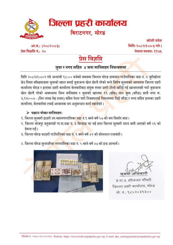 जिल्ला प्रहरी कार्यालय मोरङका अनुसार मिति २०८२/१०/०२ गते राति करिब ८ बजे मोरङ ग्रामथान गाउँपालिका–४ स्थित बाँसझ्याङ्गामा जुवा खेल भइरहेको भन्ने विशेष सूचनाका आधारमा प्रहरी टोली खटिएको थियो। जिल्ला प्रहरी कार्यालय मोरङ र इलाका प्रहरी कार्यालय बेलबारीको संयुक्त टोलीले छापा मार्दा जुवा खेलिरहेको अवस्थामा चार जनालाई नियन्त्रणमा लिएको हो।