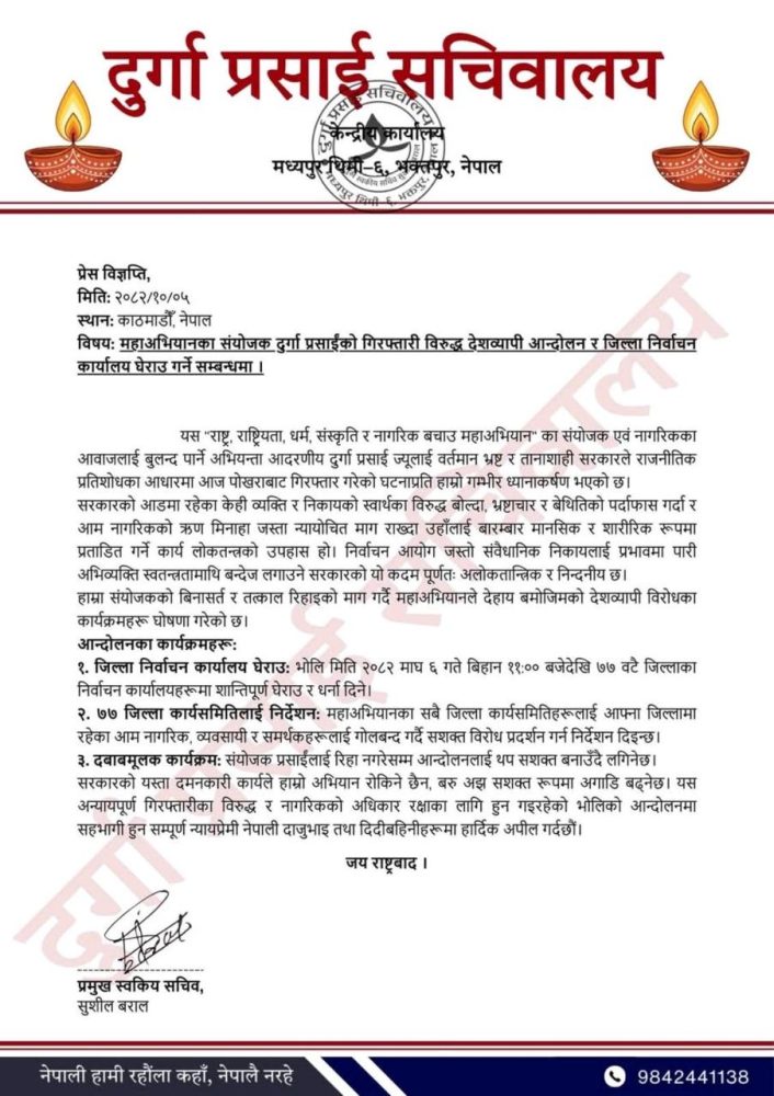 प्रेस विज्ञप्तिमा ‘जय राष्ट्रवाद’ उल्लेख गर्दै महाअभियानका प्रमुख स्वकीय सचिव सुशील बरालको हस्ताक्षर रहेको छ।